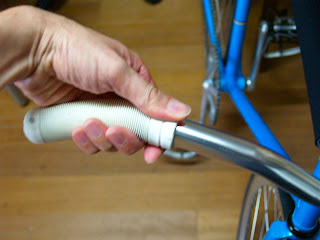 今さらながらハンドルをニットーのバックスイープしたライザーバー(Nitto B259)に変更したのですが、グリップがそんなに悪くなっていないので、そのまま利用します。上の写真は片方はハメ込み済み。