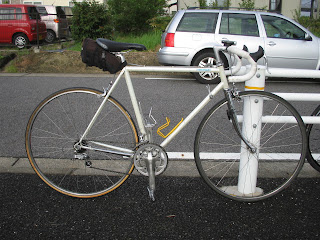 先生のバイク。ずっと乗っているズノウの25年物です。渋い!チューブラーで、コンポは古いデュラ。クランクは違いますが。とにかく登りは先生について行けませんでした。