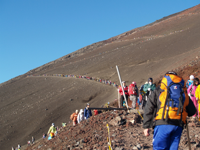 登山開始は朝6時頃でした。頂上でご来光を拝み終わって下りてくる人達が半端なくいましたねぇ。この本8合目からの道は砂利道で歩きにくくとっても疲れました。まだ階段じゃないだけいいかも、という感じではありましたが。