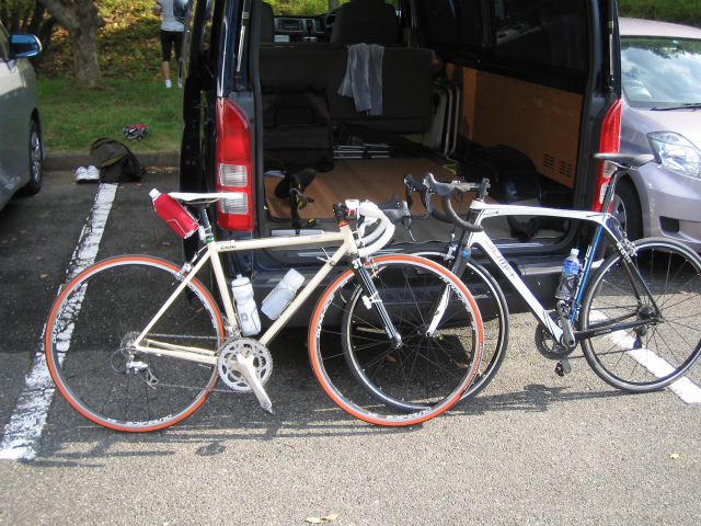 先生のバイク。ずっと乗っているズノウの25年物です。渋い!チューブラーで、コンポは古いデュラ。クランクは違いますが。とにかく登りは先生について行けませんでした。