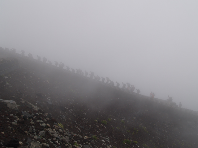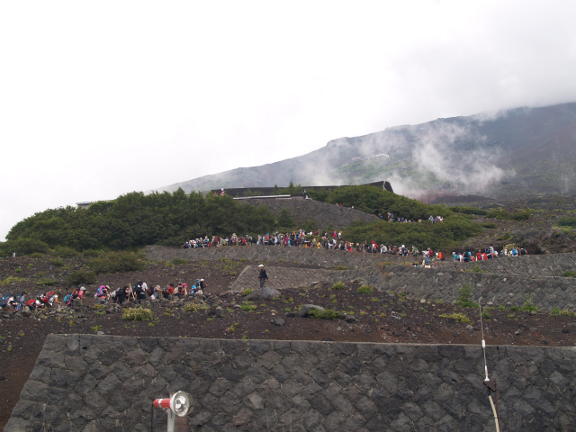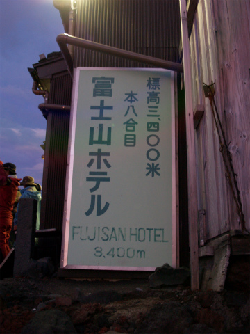 なんとか8合目に到着です。僕たちの泊まる富士山ホテルは8合目なので、「あぁやっと到着だぁ」なんて喜んだのもつかの間、富士山ホテルは下の写真のようにまだ遥か上のほうにあり、愕然としました。実はこの時点でもう頭がガンガンしており、ほんとに下山したくなっていました。でも小学生の女の子も携帯酸素をすいながら頑張っていたので、いい年こいた大人が泣き言を言う訳にはいきません。